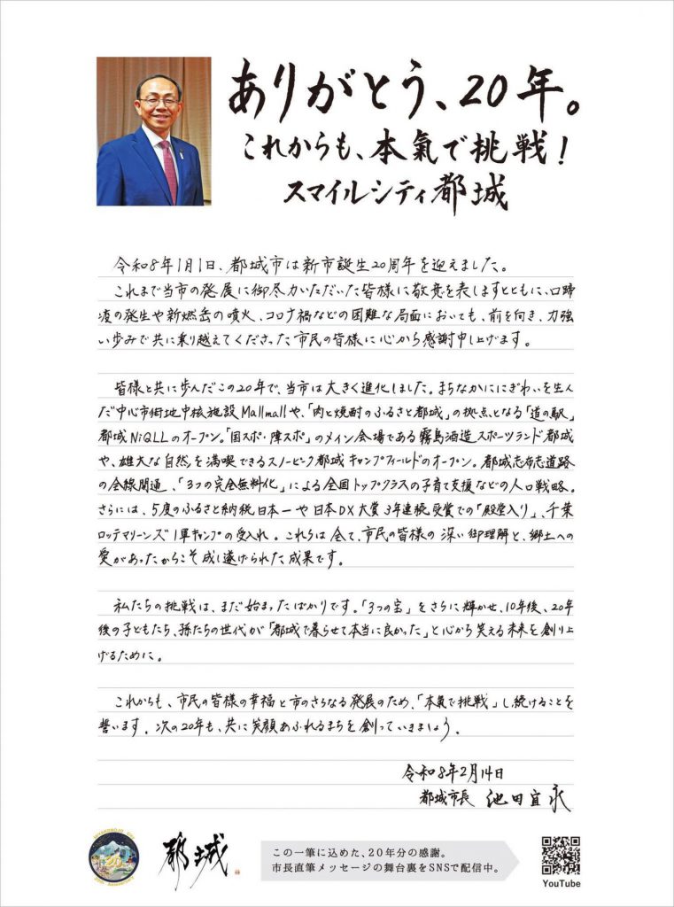 次の20年も本市が更に発展し、次の世代であるお子様・お孫様の世代に「今よりも元気な都城」を引き継いでいけるよう、私も自分自身の役割を、引き続きしっかりと果たしてまいります。