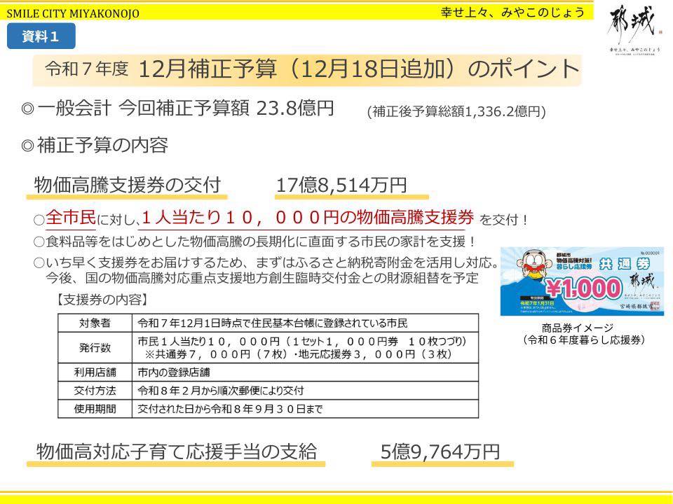 都城市では、物価高騰対策として『市民1人当たり10,000円の物価高騰支援券』を全市民に配付致します❗️